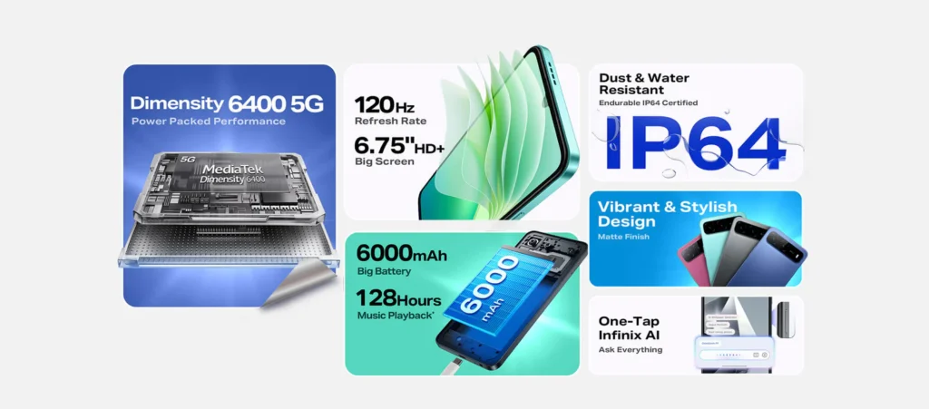 Infinix Hot 60i 5G में 5000mAh की बड़ी बैटरी दी गई है, जो एक बार चार्ज करने पर पूरे दिन का बैकअप आराम से देती है।