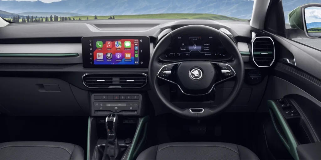 Skoda Kylaq 2025 का इंटीरियर काफी क्लासी और हाई-टेक है। इसमें ड्यूल-टोन प्रीमियम लेदर सीट्स और एंबिएंट लाइटिंग दी गई है।